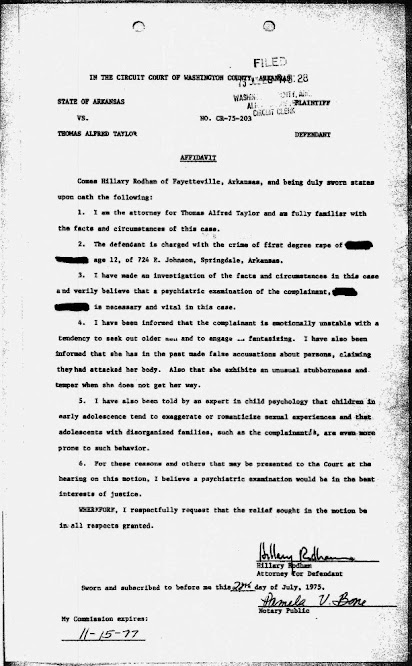 hat kind of monster would consciously stoop so low as to accuse a very scared 12-year-old girl, traumatized for life by a brutal rape, of somehow provoking or enticing a sickening sac of "human" sewage to horrendously assault and violate her? Especially when it's based not on any real, allowable evidence but solely on unsourced hearsay, poisonous innuendo, self-serving generalizations, as well as maliciously libelous swipes at the victim's family? Clearly an extremely cruel and sadistic kind. The only insult she forgot to lob the rape victim's way was "what difference, at this point, does it make?"! Luckily for raped little girls everywhere, the Hildabeast isn't allowed to practice law anymore in any court in the land. Unluckily for the American people, this monster stubbornly refuses to go away. It's up to truth tellers to leave her no other choice than ignominiously slither back forever down to the perfidiously putrid depths whence she came. “The victim said if she saw Clinton today, she would call her out for what she sees as the hypocrisy of Clinton’s current campaign to fight for women’s rights compared to her actions regarding this rape case so long ago. “‘I would say (to Clinton), “You took a case of mine in ’75, you lied on me... I realize the truth now, the heart of what you’ve done to me. And you are supposed to be for women? You call that (being) for women, what you done to me? And I hear you on tape laughing.”’”